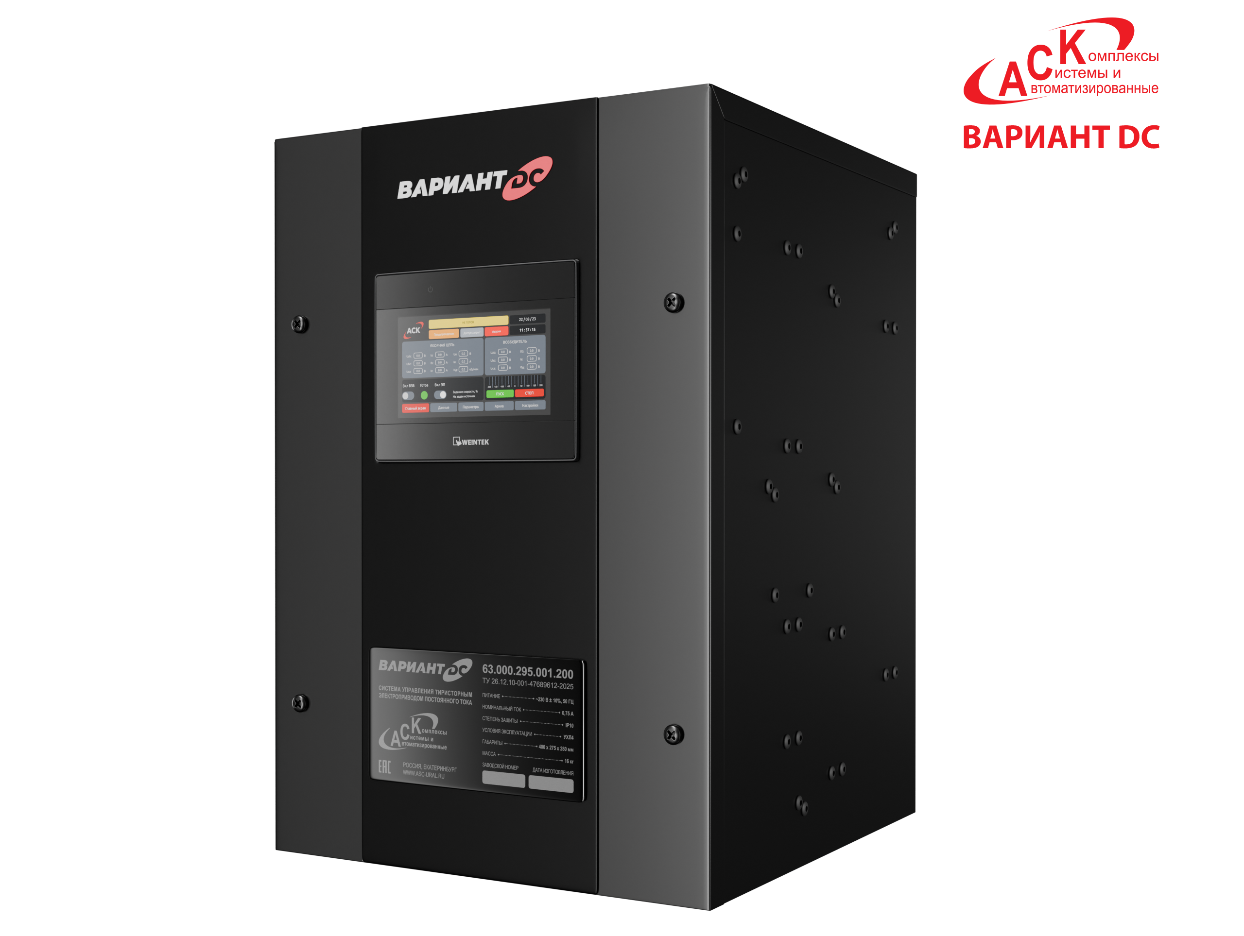DC drive control system «Variant DC» is made as a microprocessor-based control module, which is designed to control an external three-phase reversible bridge thyristor rectifier, supplying power to the motor armature circuit, and also to energize an excitation circuit. Control is achieved through regulating the electric motor rotation velocity or torque. Support of Profibus DP, Profinet and Modbus communication protocols is provided. The control module can be used in conjunction with the rectifier sections of ASC make.